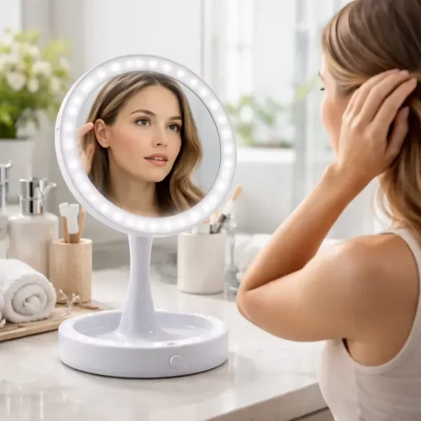 ¡Lleva tu rutina de belleza al siguiente nivel con el espejo LED Hytoshy HT-988E! Diseñado para quienes buscan precisión y comodidad, este espejo es el aliado perfecto para lograr un maquillaje impecable, un peinado detallado o un cuidado facial profundo en cualquier lugar.