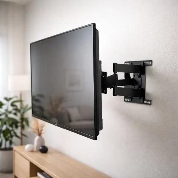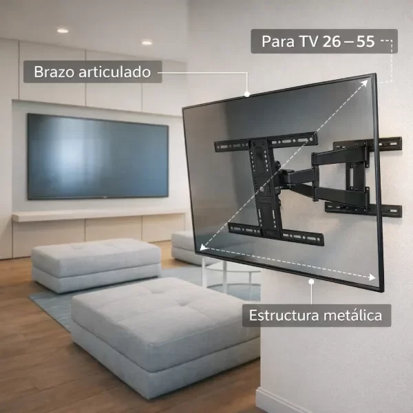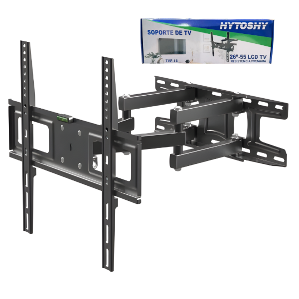 Soporte de TV de pared con brazo articulado, fabricado en estructura metálica color negro. Diseñado para televisores LCD dentro del rango indicado, permite extensión, giro lateral e inclinación para ajustar el ángulo de visión según la posición del usuario. El producto se identifica en el empaque como modelo TVF-13 y se entrega con herrajes de montaje visibles en el interior de la caja.