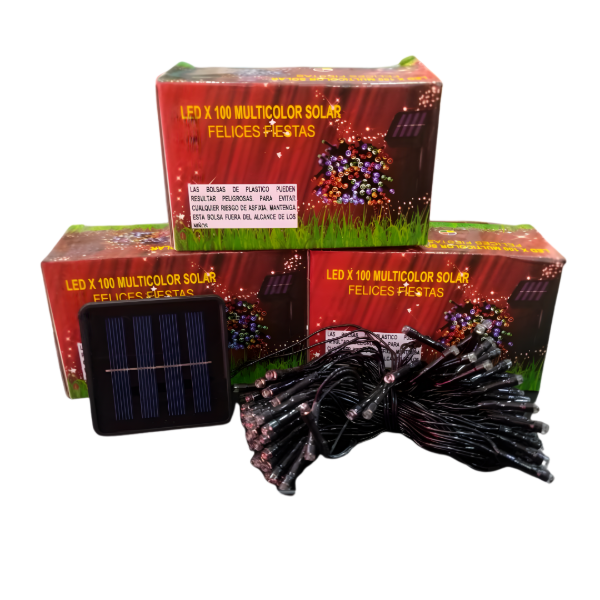 Luces solares LED de 100 lámparas multicolor, ideales para Navidad y decoración exterior. Funcionan con energía solar, se encienden automáticamente de noche y se apagan durante el día. Son impermeables IP65, resistentes a lluvia, nieve y altas temperaturas.