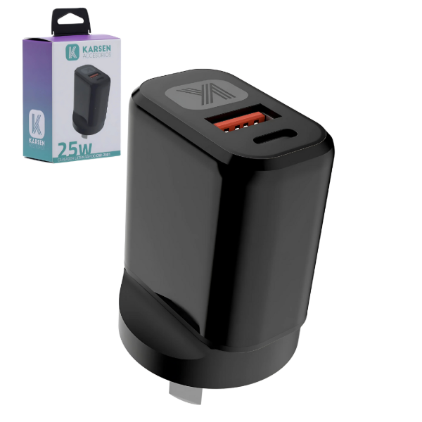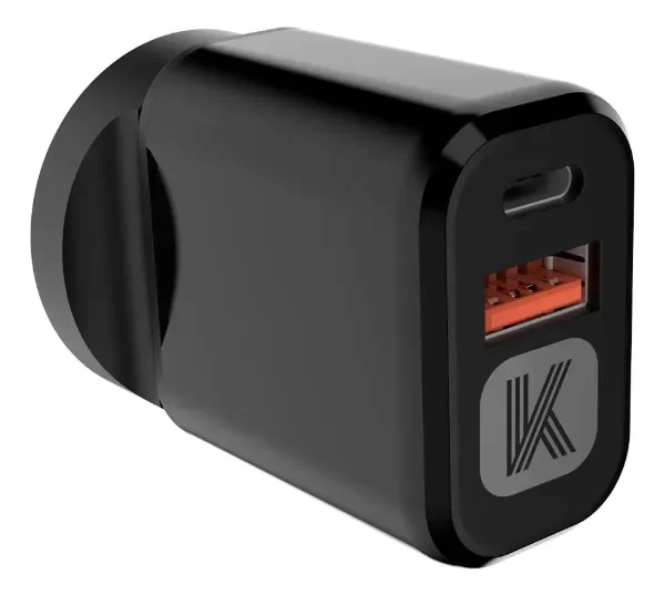 Cargador Karsen con Salidas USB y USB-C que te brindan mayor flexibilidad al poder usarlo con el cable que prefieras para los equipos que necesites.