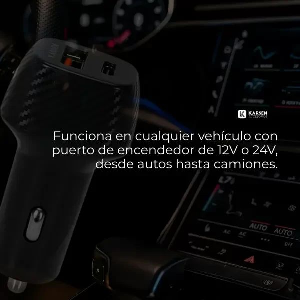 Este cargador te ofrece 2 puertos USB (A y Tipo C), lo que te permite cargar múltiples dispositivos de forma rápida y eficiente, sin tener que esperar horas. Con su cable USB Tipo C a C desmontable de 1.2m, podrás conectar tus dispositivos fácilmente, y su entrada de 12V-24V asegura compatibilidad, una carga estable y rápida en cualquier vehículo.