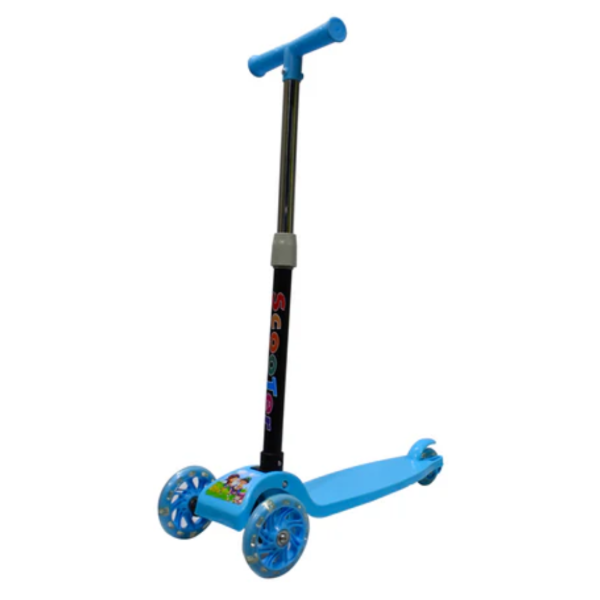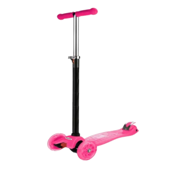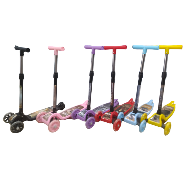 Los monopatines están disponibles en diversos colores de base y manillar (negro, rosa, púrpura, rojo, celeste y amarillo), con una estructura de tres ruedas para mayor estabilidad.