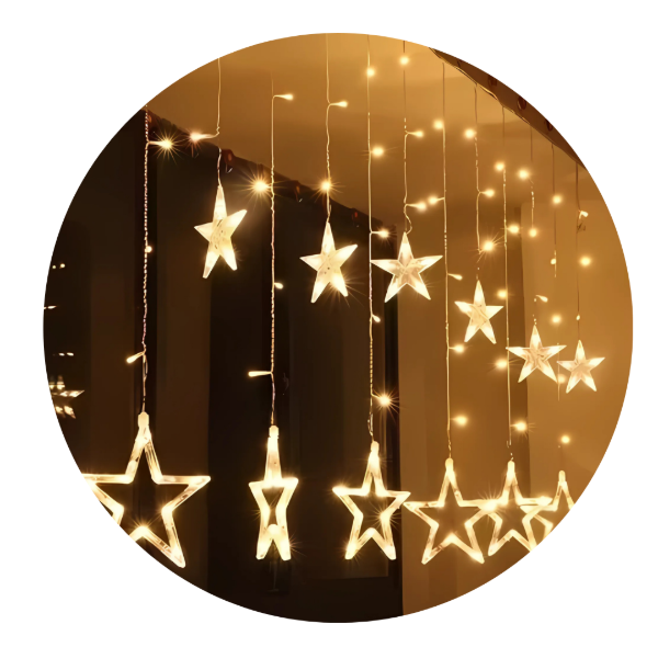 Cortina de Luces LED con Estrellas de distintos tamaños. Ideal para decorar todo tipo de eventos, hogares, negocios o lo que vos quieras. Es de muy bajo consumo y genera muy poca temperatura. La guirnalda tiene un ancho de 3 metros y que contiene 10 tiras de distintos largos, que van desde 43 cm. la tira mas corta a 130 cm. la mas larga. El cable desde la primer tira hasta el aenchufe tiene 130 cm. El color de la luz es blanco cálido.