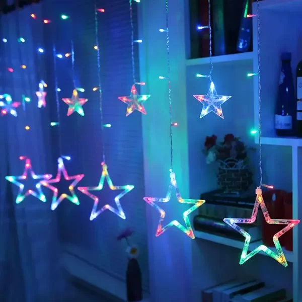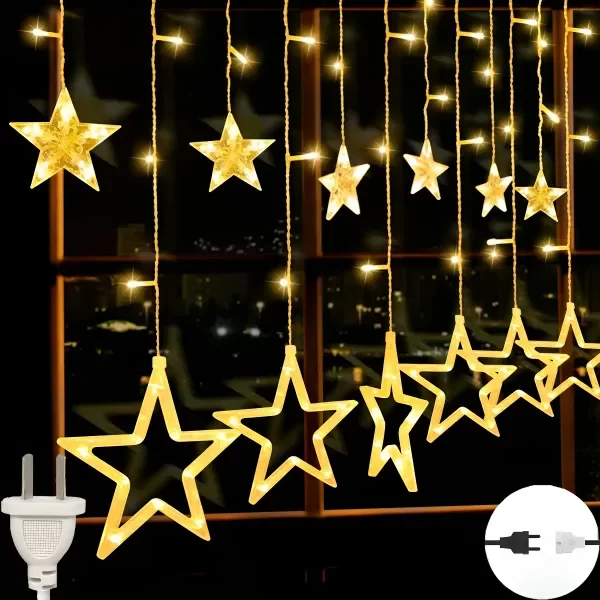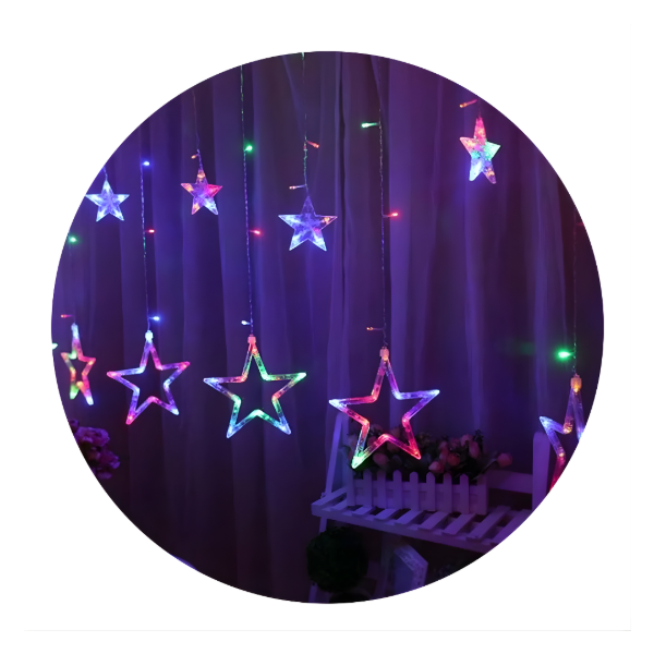 La cortina de luces LED con estrellas es ideal para decorar interiores durante Navidad, eventos especiales o para ambientar cualquier espacio del hogar. Su diseño tipo lluvia, con estrellas grandes y pequeñas, ofrece un efecto luminoso atractivo y moderno.