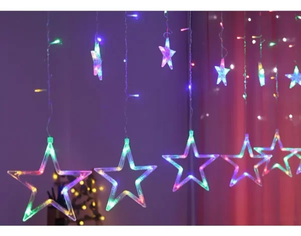 Esta cortina cuenta con una tira principal de 4 metros, de la cual se desprenden 12 tiras verticales decoradas con 6 estrellas grandes y 6 estrellas pequeñas, todas con luces LED multicolor. Además, incorpora pequeñas luces adicionales también en RGB para potenciar el brillo.